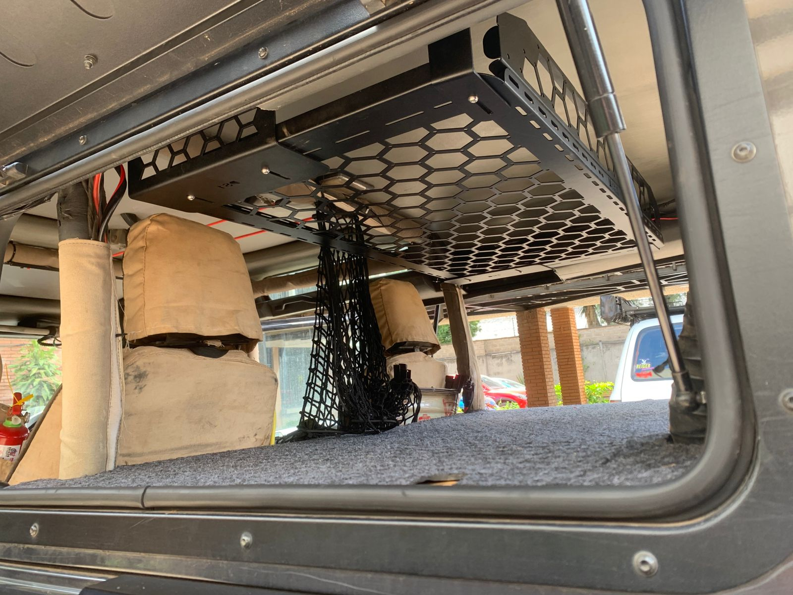 Bolts into the rear grab-handle points — no damage to your interior. - MOLLE-compatible mounting system