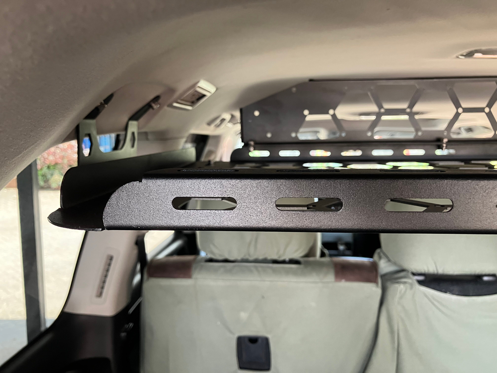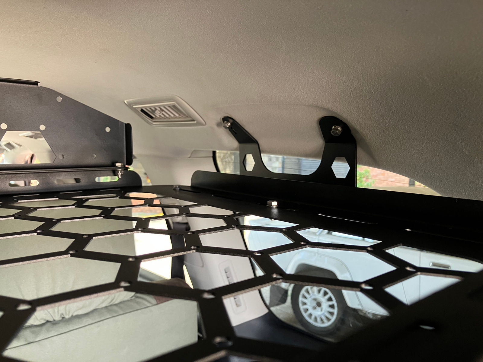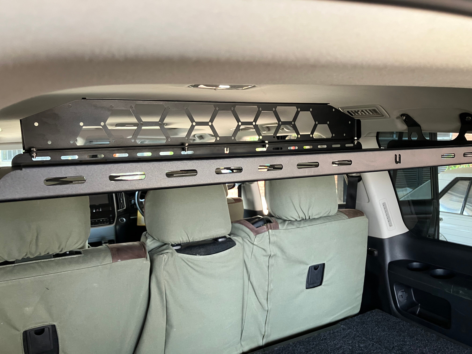 Bolts into the rear grab-handle points — no damage to your interior.