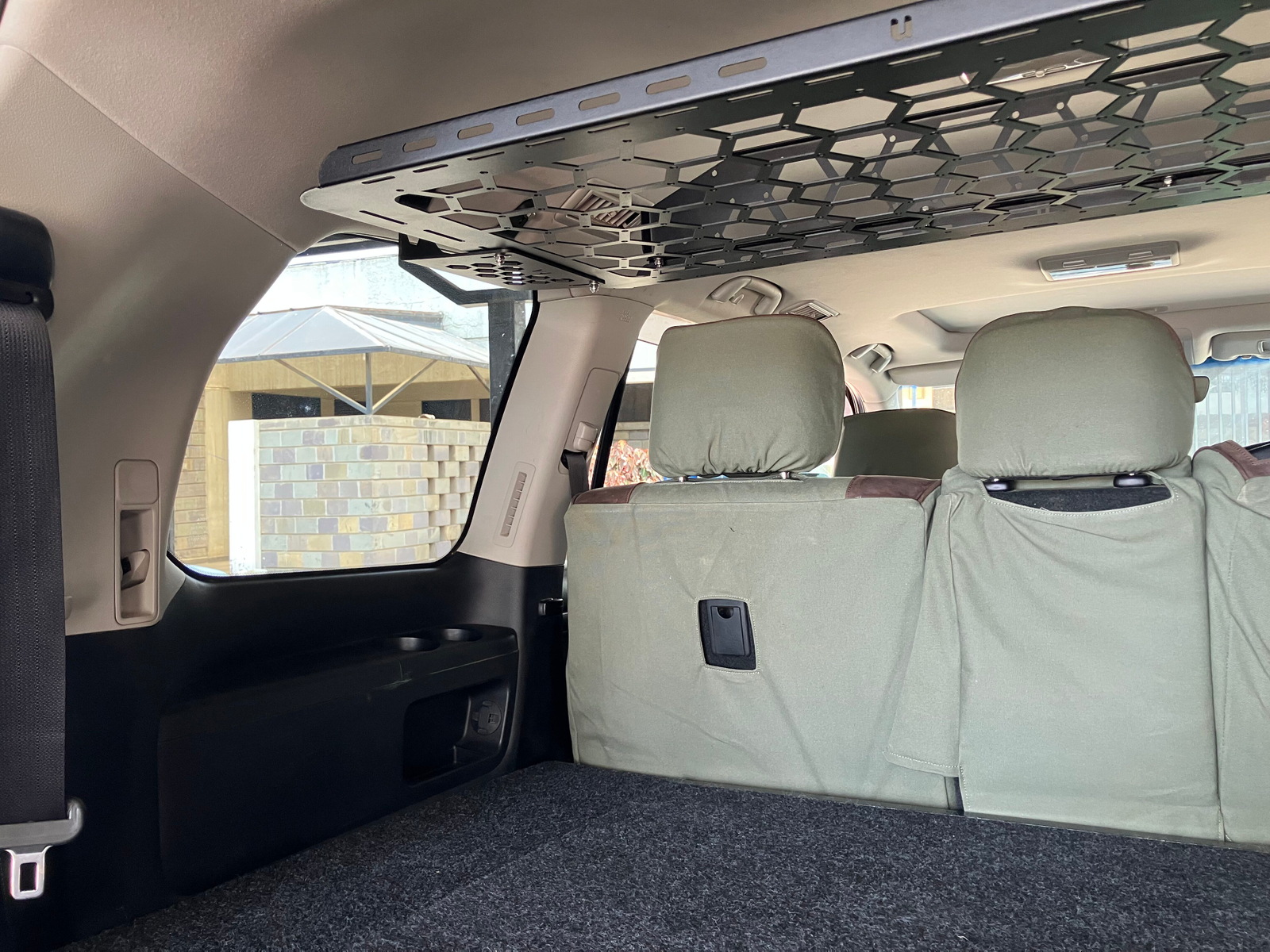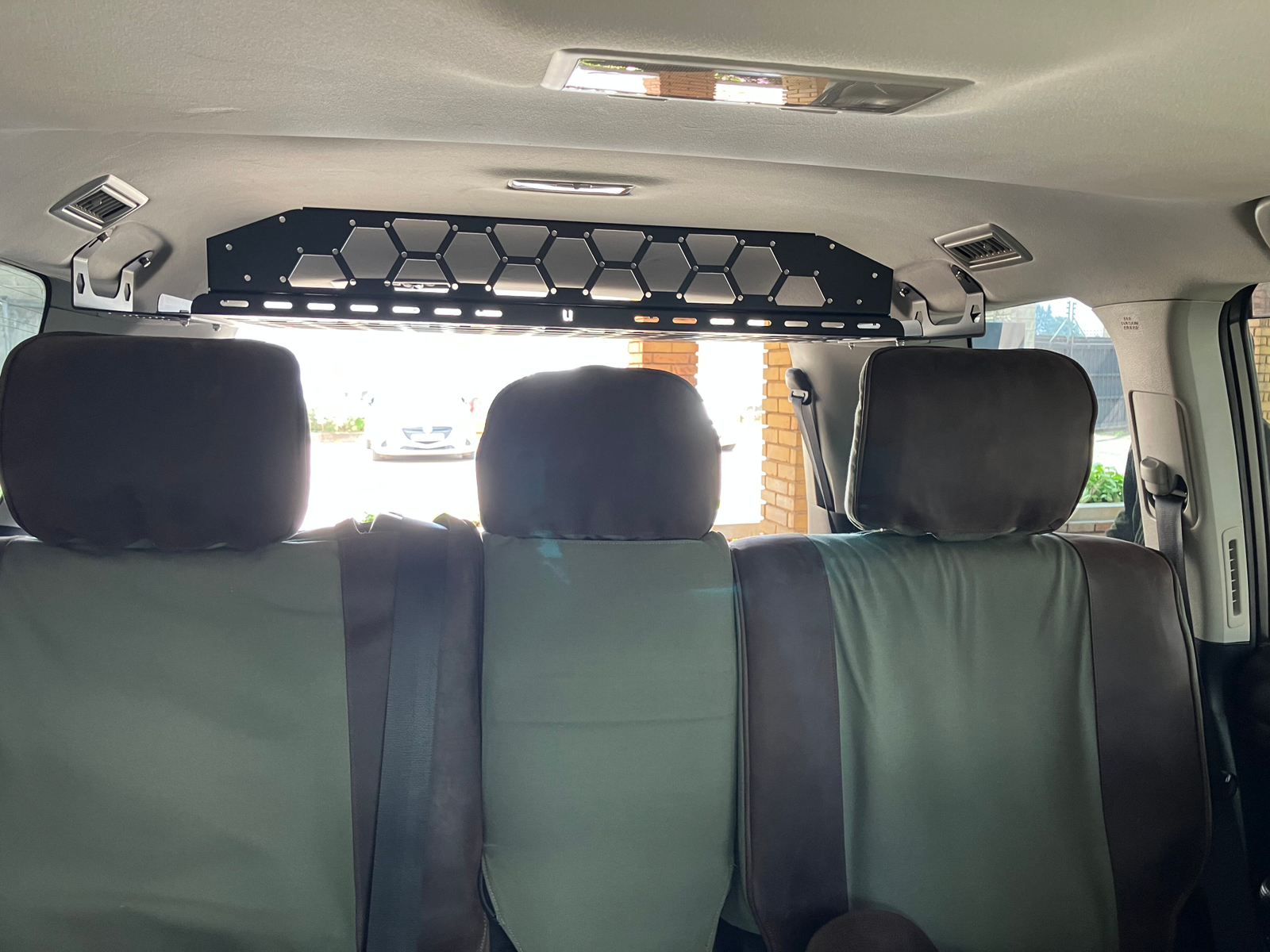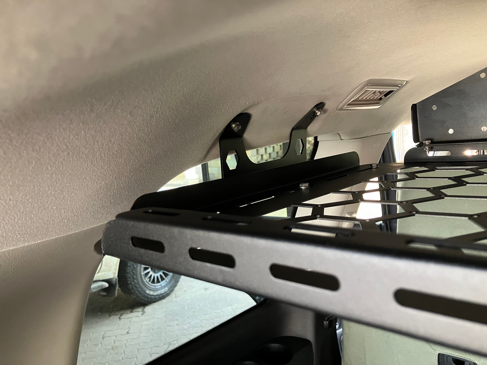Bolts into the rear grab-handle points — no damage to your interior.