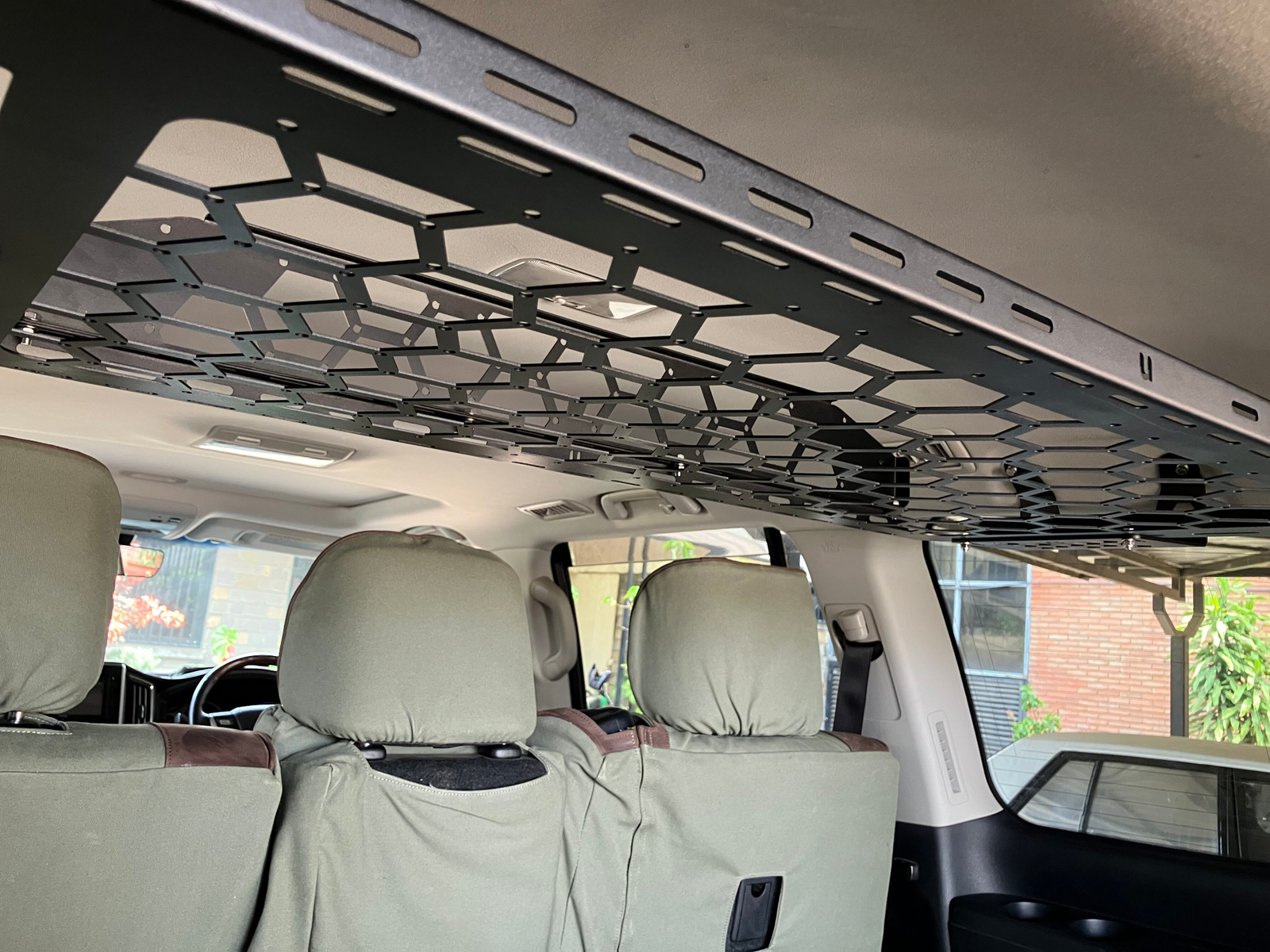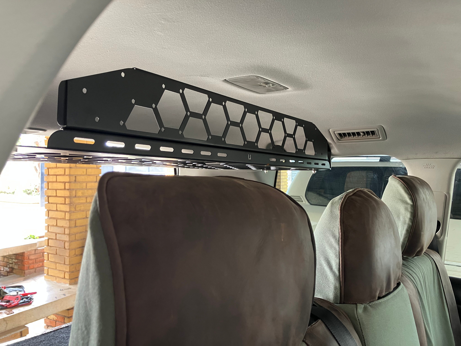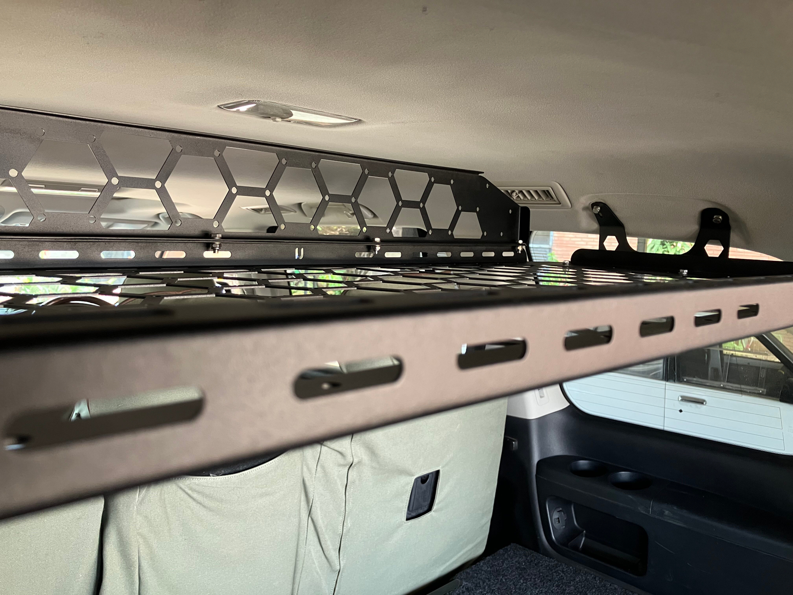 A slimline roof shelf designed to reclaim wasted vertical space inside your vehicle. Perfect for organising lightweight essentials while keeping them secure, quiet, and easy to access. Features a MOLLE compatible design, drill free installation, and a strong yet lightweight build engineered for long term use in tough Kenyan conditions.